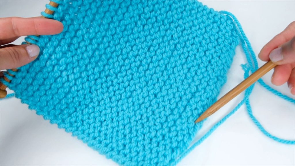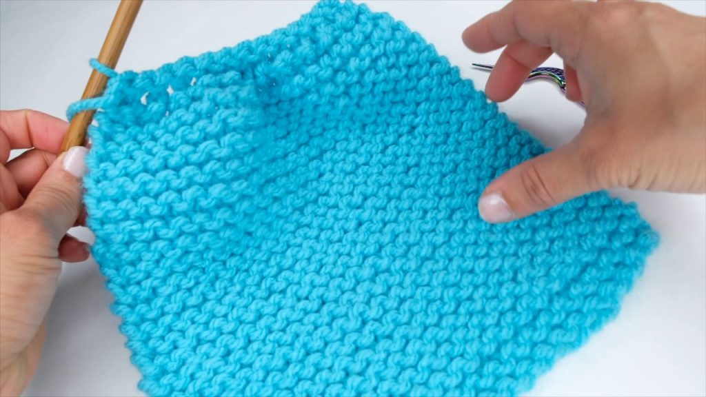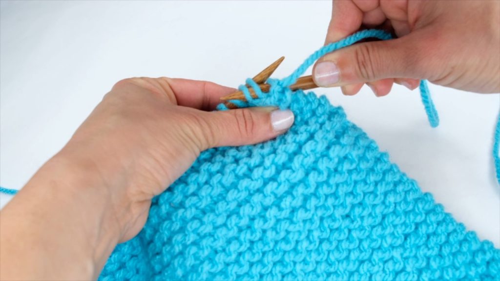 Purl the entire first row. Then row 2 onwards, slip the first stitch on to the other needle without purling and purl the rest. Make such rows until you achieve 22 bumpy rows (19 rows to fit sizes 5-10).