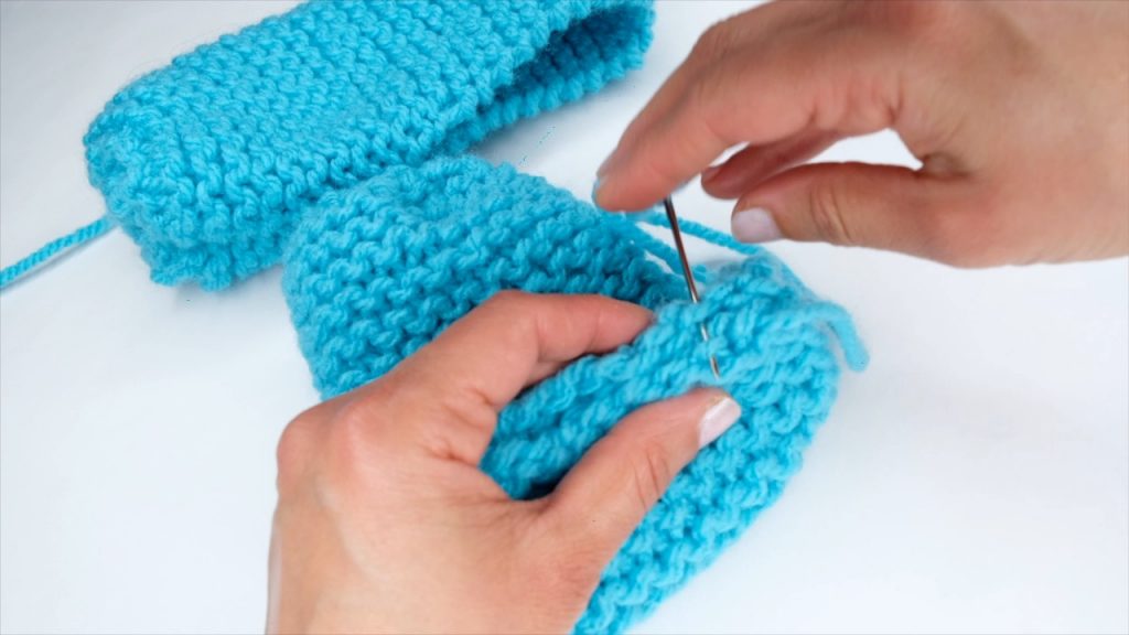 Fold and sew the back (casted on) part of the bootie together. Use the second row of yarn to bind the fabric. Reverse the bootie inside out.