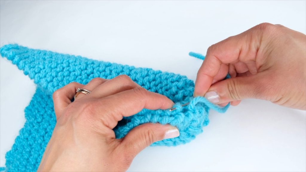 Identify the front side of the fabric with the cast on and fold it inwards. Sew the top half of the fabric together by putting the needle through the bumps across from each other.