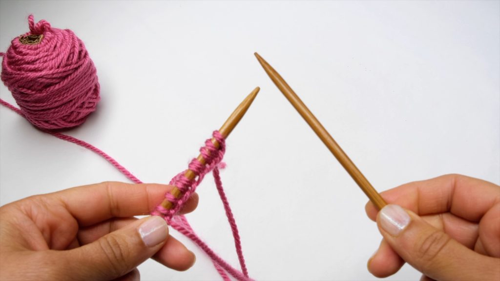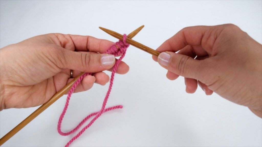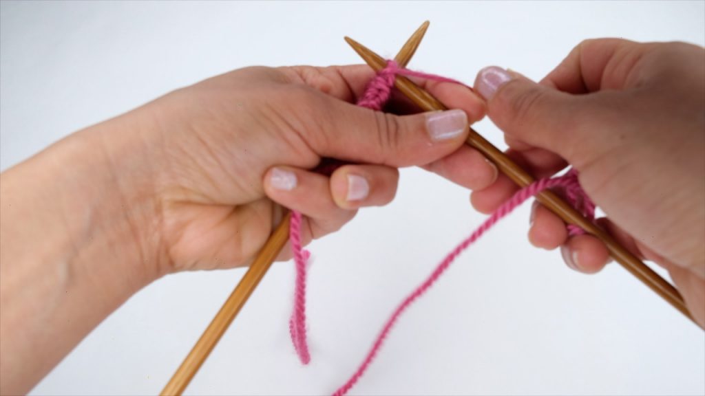 Hold the wrapped around working end of the yarn with the needle. Push the needle in the dominant hand down and towards the needle in your non-dominant hand.