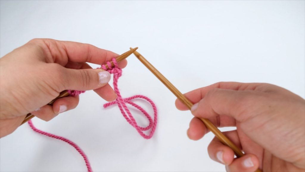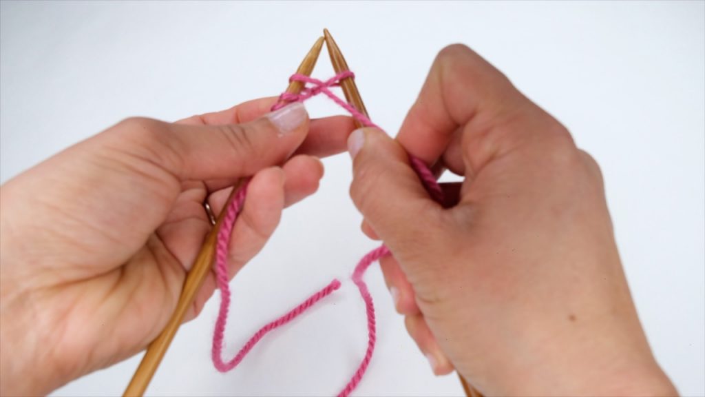 Make sure the working end of the yarn is in front of the needles. Wrap this yarn around the empty needle from the back to the front in an anti-clockwise direction.